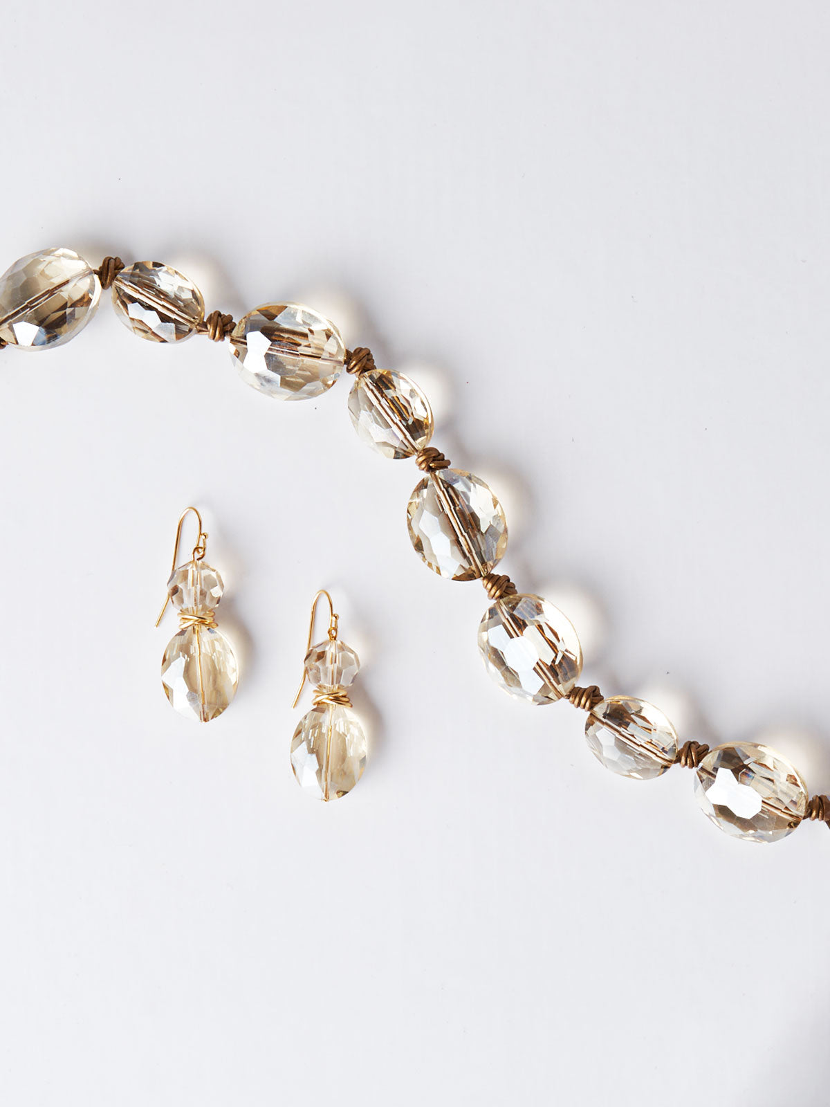 Our Champagne Crystal Leather Necklace is a subtle piece that can elevate any style. The leather wrapping is an added touch, offering the piece a bit of texture. Pair back with the matching earrings for a complete set.