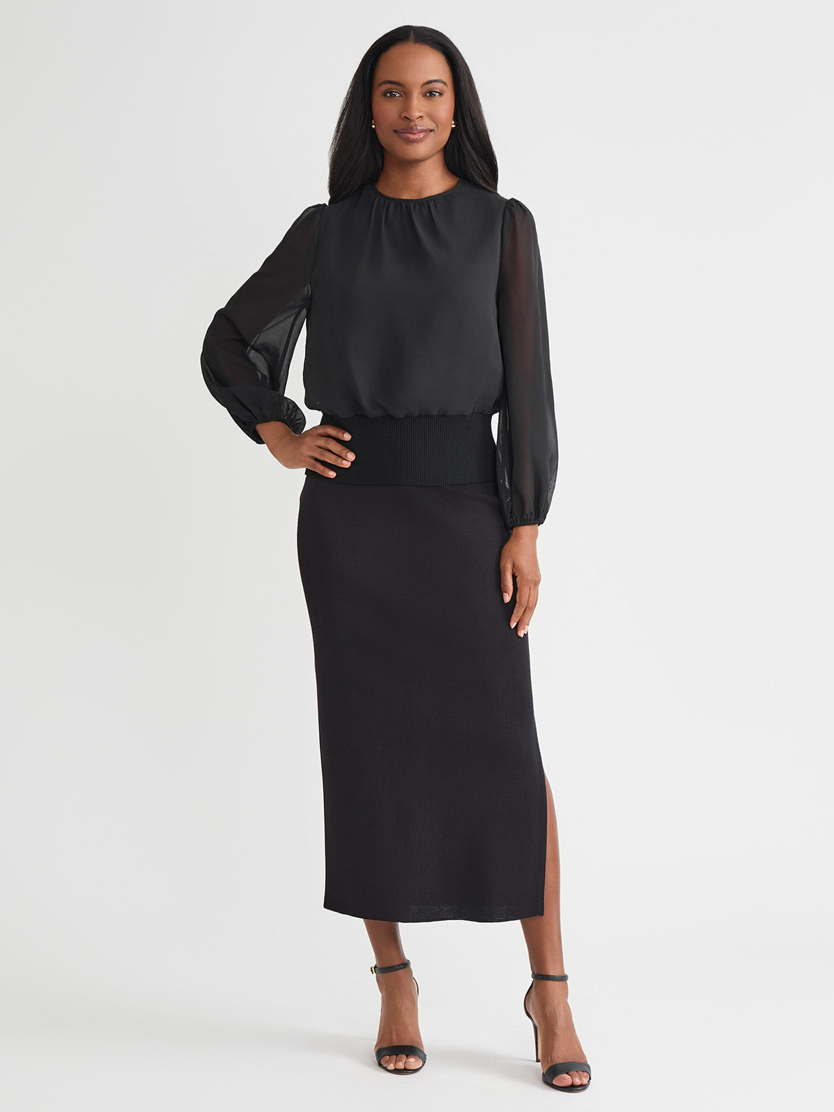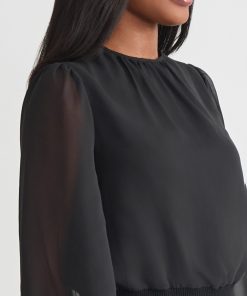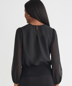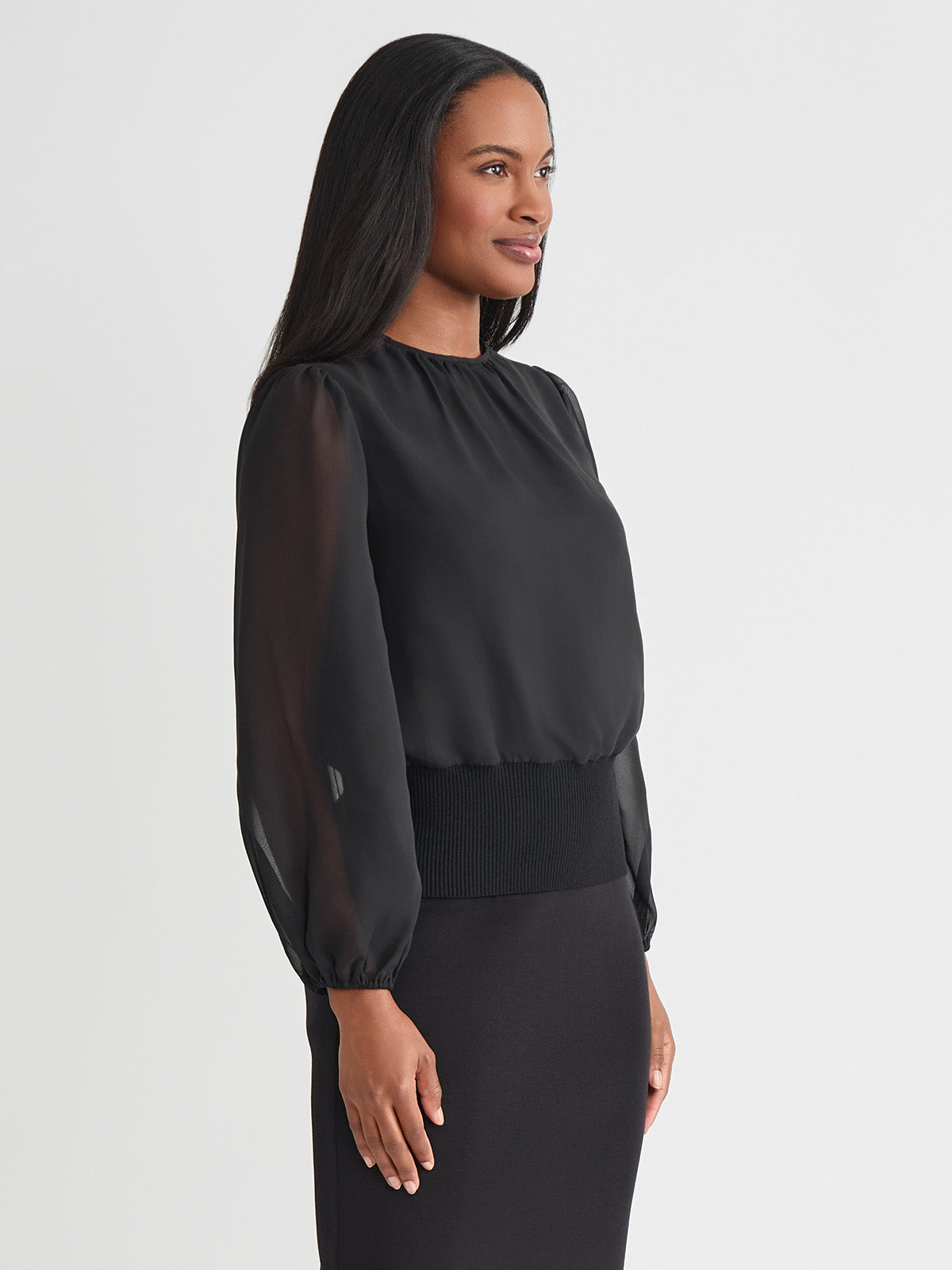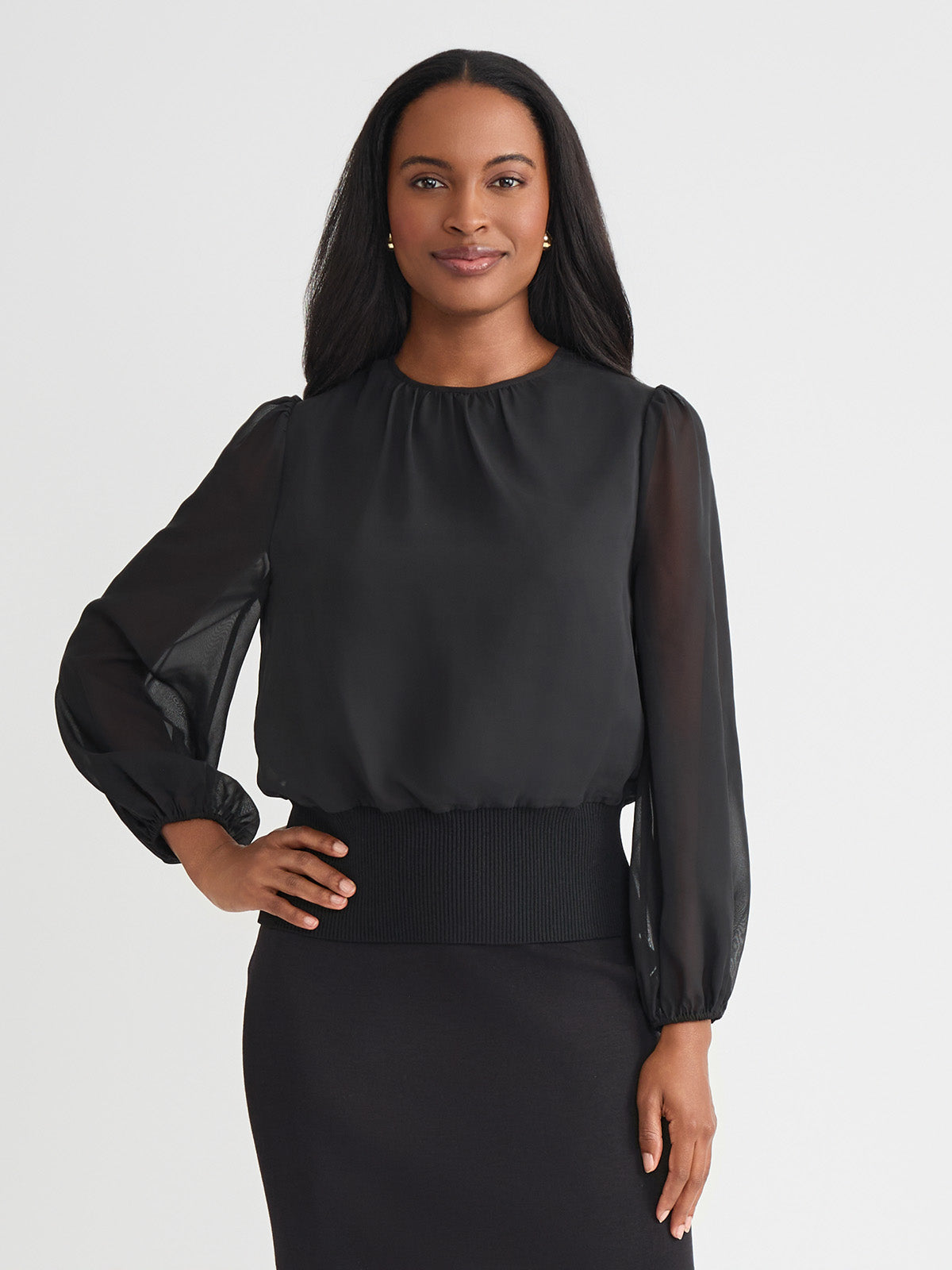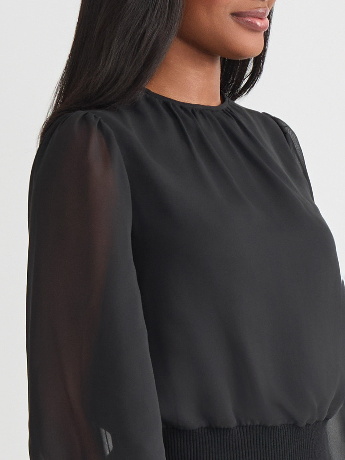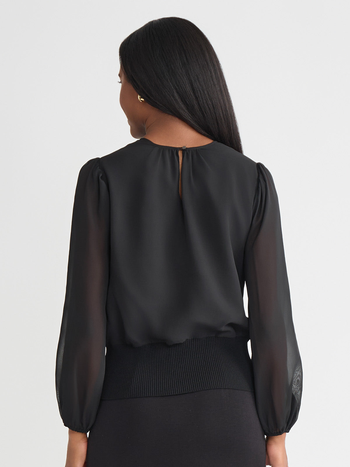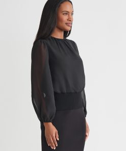Softly sophisticated with a touch of drama, the Chiffon Sheer Sleeve Top brings elevated charm to your occasion wardrobe. Framed by a classic jewel neckline, this top features long, sheer puff sleeves that float gracefully with every movement, finished with delicate elastic cuffs for a romantic silhouette. A ribbed knit hem creates a flattering shape and adds modern structure to the airy design. Perfectly poised to pair with sleek trousers or an A-line skirt, it transitions effortlessly from day events to evening gatherings.