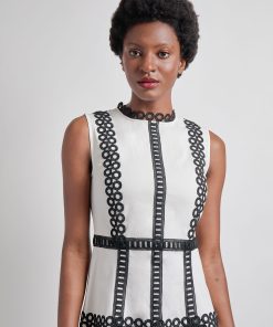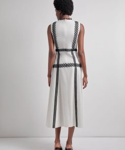 Enchant in the epitome of timeless elegance with our Maxi Fit & Flare Dress, a sartorial masterpiece that seamlessly weaves together grace and sophistication. Crafted from White cotton with delicate Black eyelet trim, this maxi dress boasts a fit & flare silhouette that gracefully accentuates the feminine form. The jewel neck collar and back zipper closure add a touch of refined charm, while the sleeveless design exudes understated sophistication. The decorative eyelet trim creates an intricate and enchanting detail, elevating the dress to a work of art. Embrace the allure of modern romance with this exquisite piece, designed for the woman who appreciates the harmonious blend of classic style and contemporary allure. 100% Cotton; Unlined Trimming: 100% Polyester Hand Wash in Cold Water; Do Not Bleach Woven Cotton Eyelet Trim Maxi Dress Jewel Neck Collar; Back Zipper Closure Sleeveless; Decorative