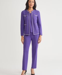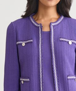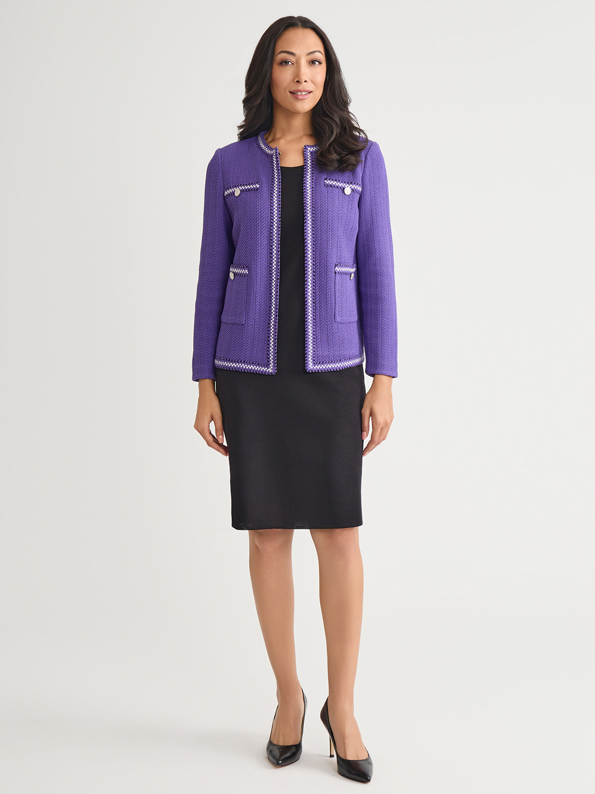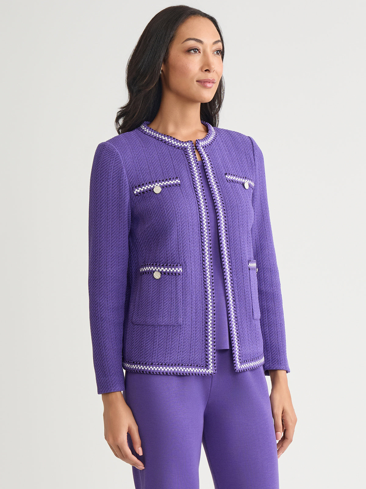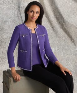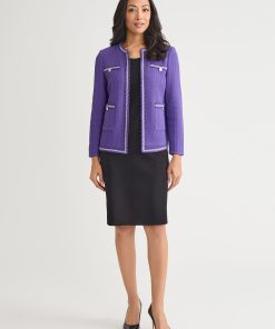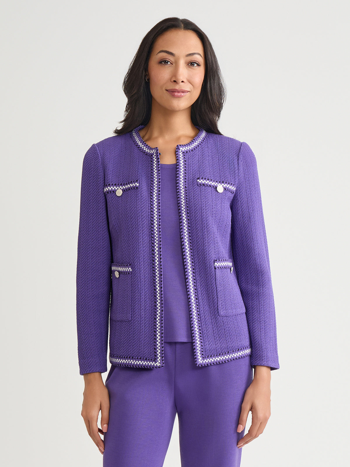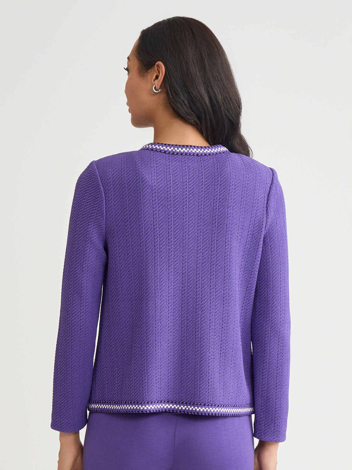 Elevate your workwear wardrobe with the Checkered Trim Knit Jacket, a versatile and sophisticated piece designed for the modern professional. With its sleek 23-inch length and flattering jewel neck, this jacket offers a polished look that seamlessly transitions from the office to after-hours events. Perfect for layering over blouses, dresses, or even casual attire, this knit jacket is an essential addition to any business casual or formal wardrobe.