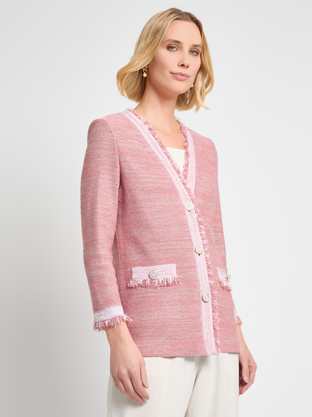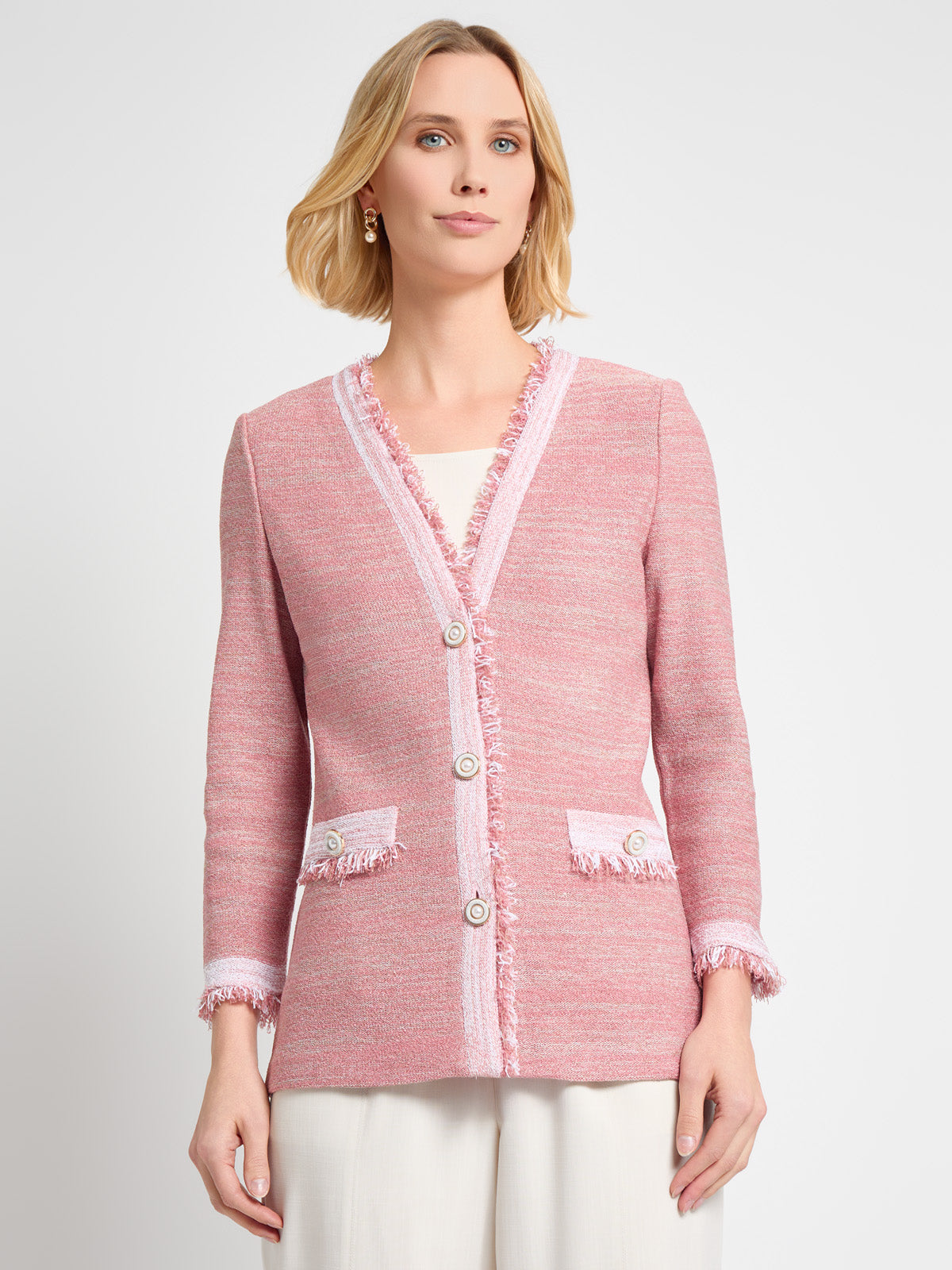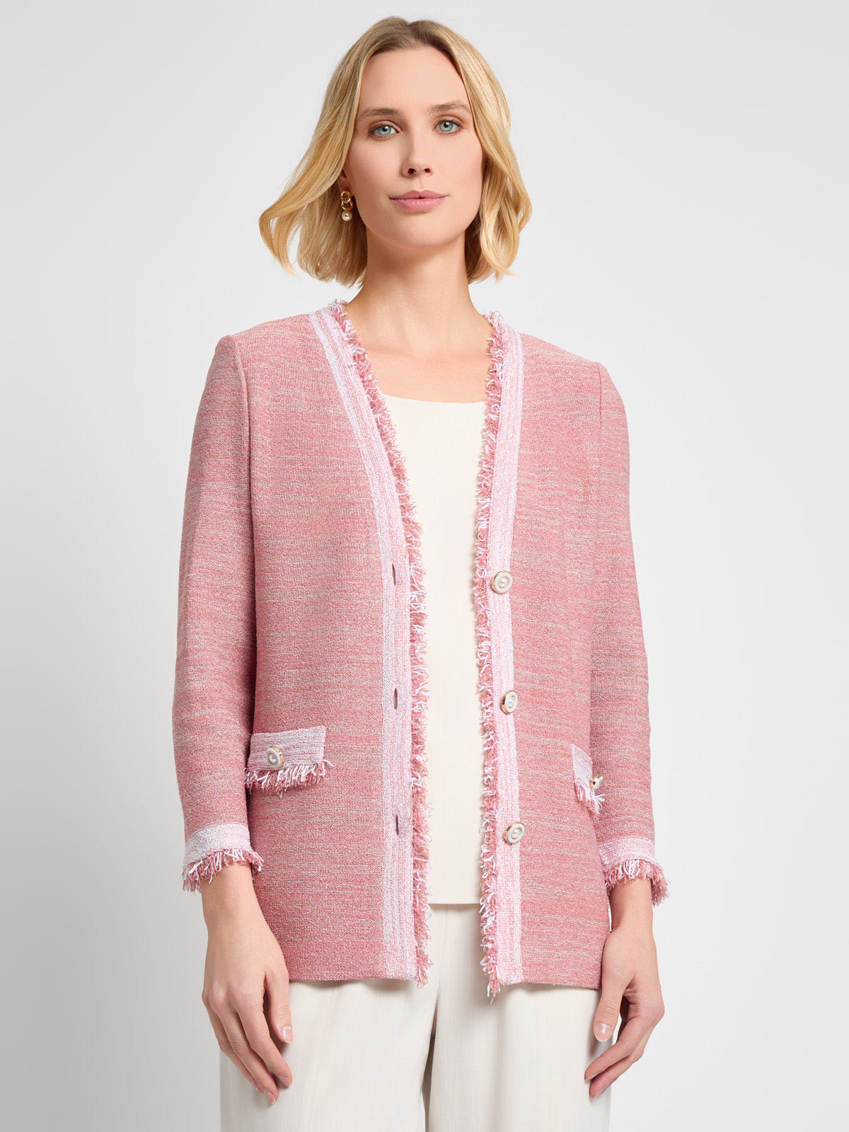 This wrinkle-resistant melange knit jacket combines timeless design with modern detailing. Featuring a flattering heritage silhouette, soft shoulder pads, and a front pearl button closure, this jacket adds a sophisticated touch to any outfit. The fringe trim and faux pocket details enhance its unique, chic look, while the bracelet-length sleeves add a stylish finish.