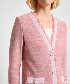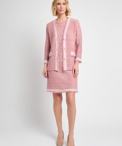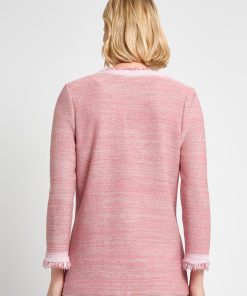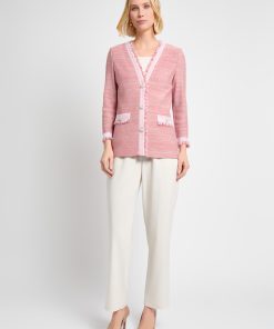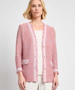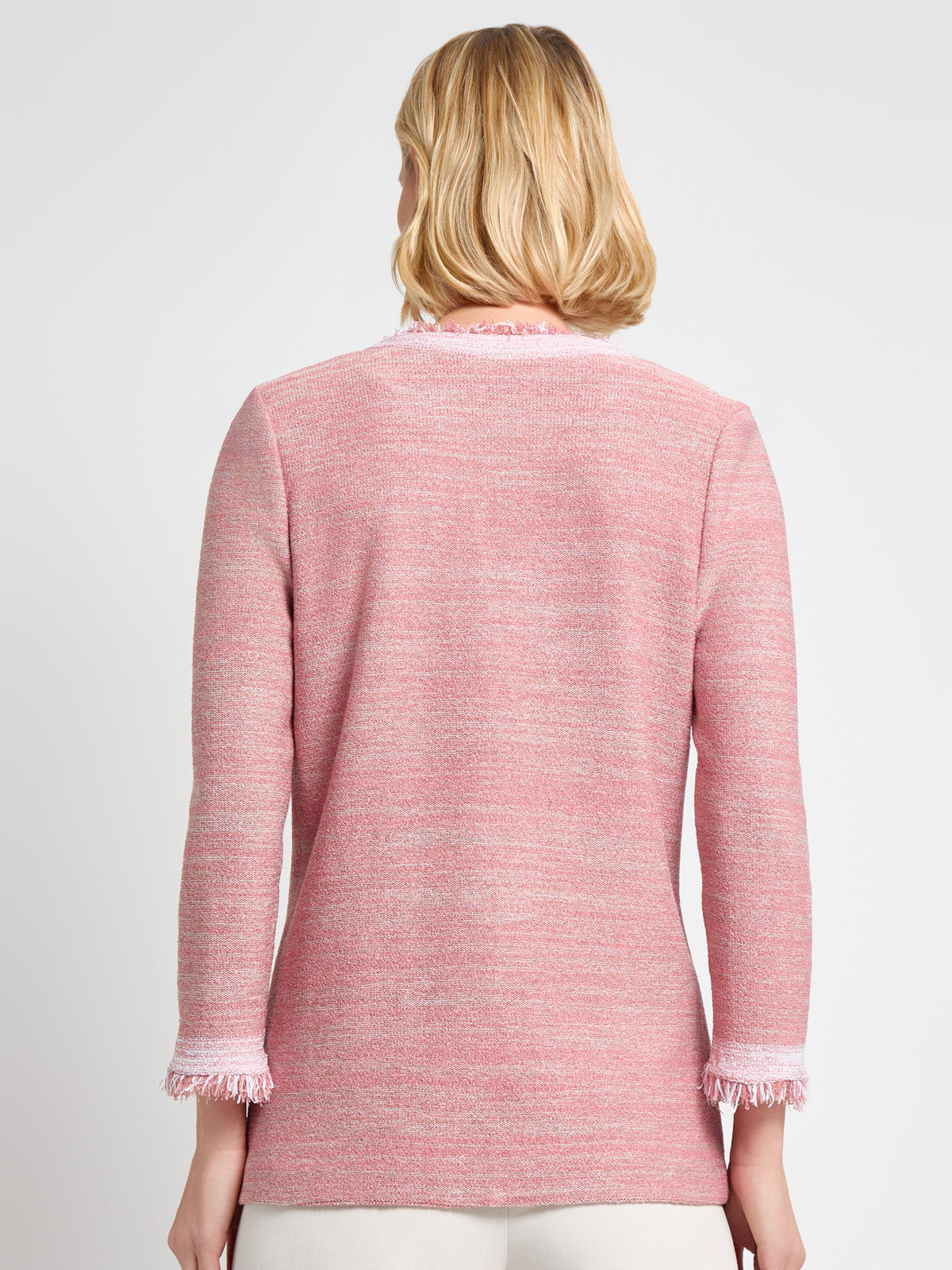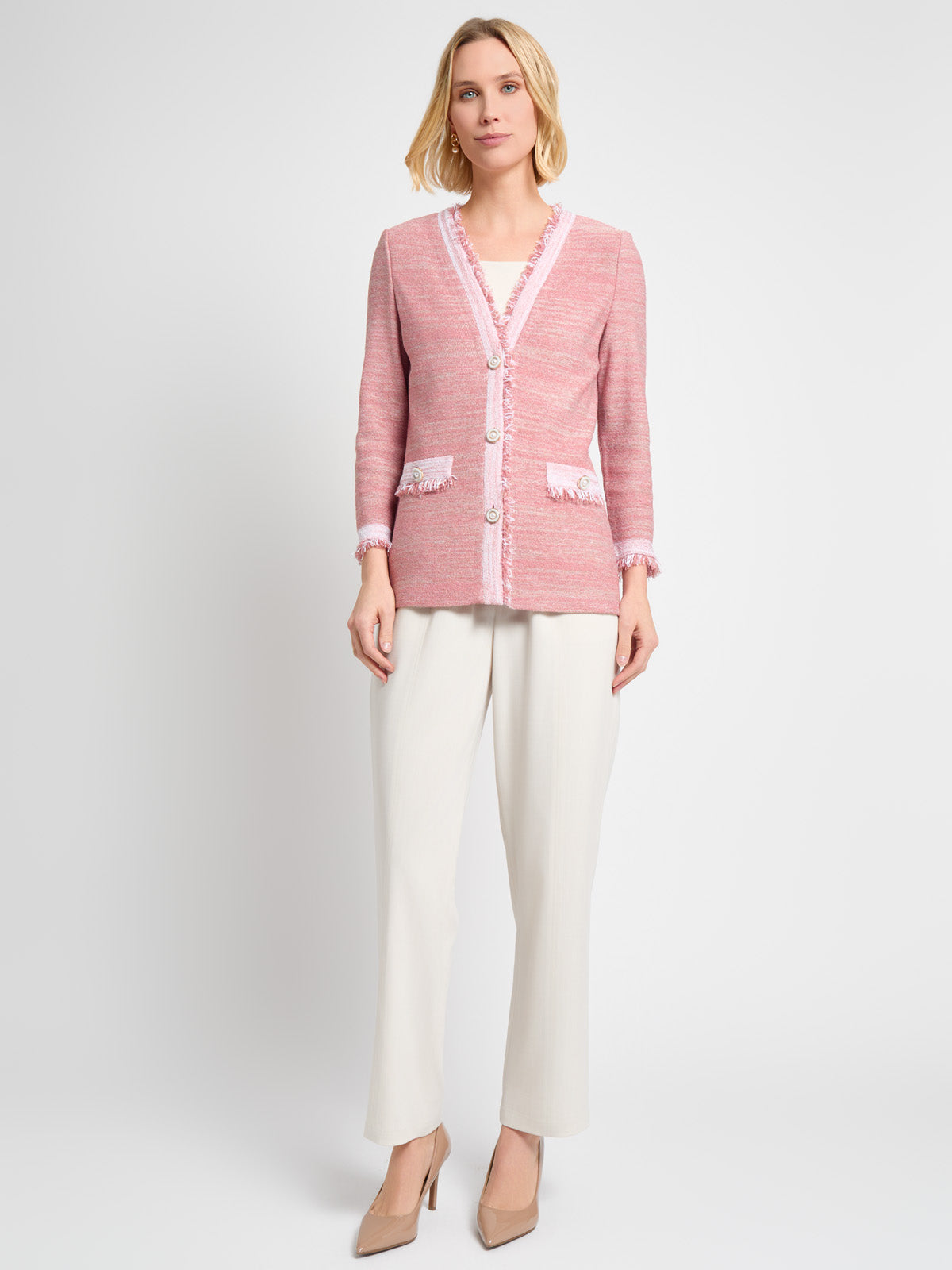 This wrinkle-resistant melange knit jacket combines timeless design with modern detailing. Featuring a flattering heritage silhouette, soft shoulder pads, and a front pearl button closure, this jacket adds a sophisticated touch to any outfit. The fringe trim and faux pocket details enhance its unique, chic look, while the bracelet-length sleeves add a stylish finish.