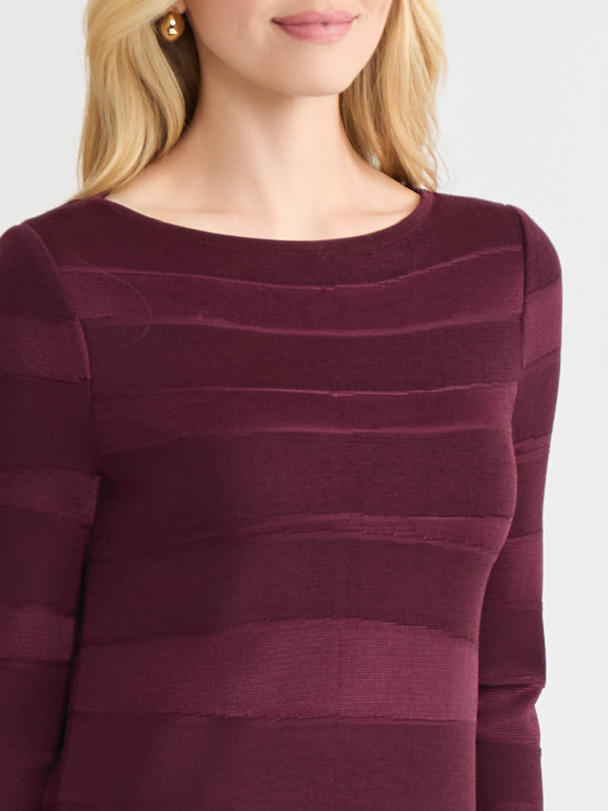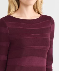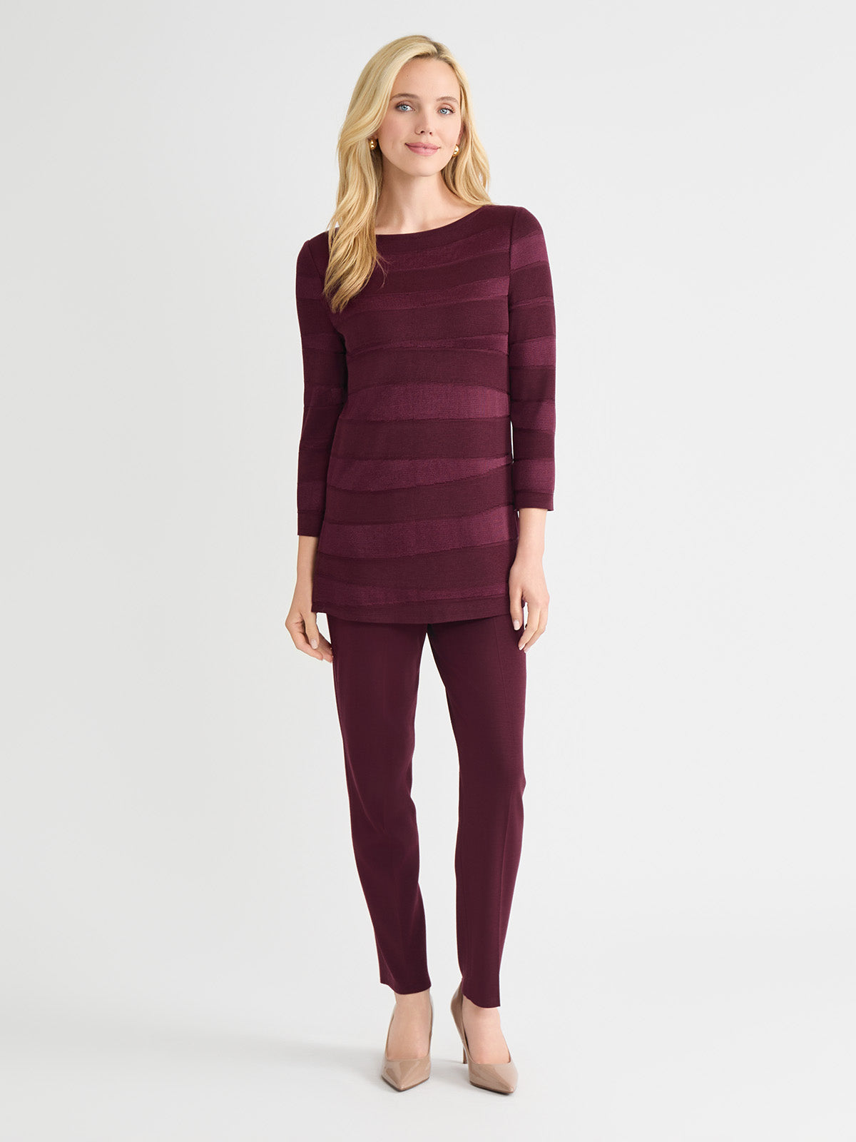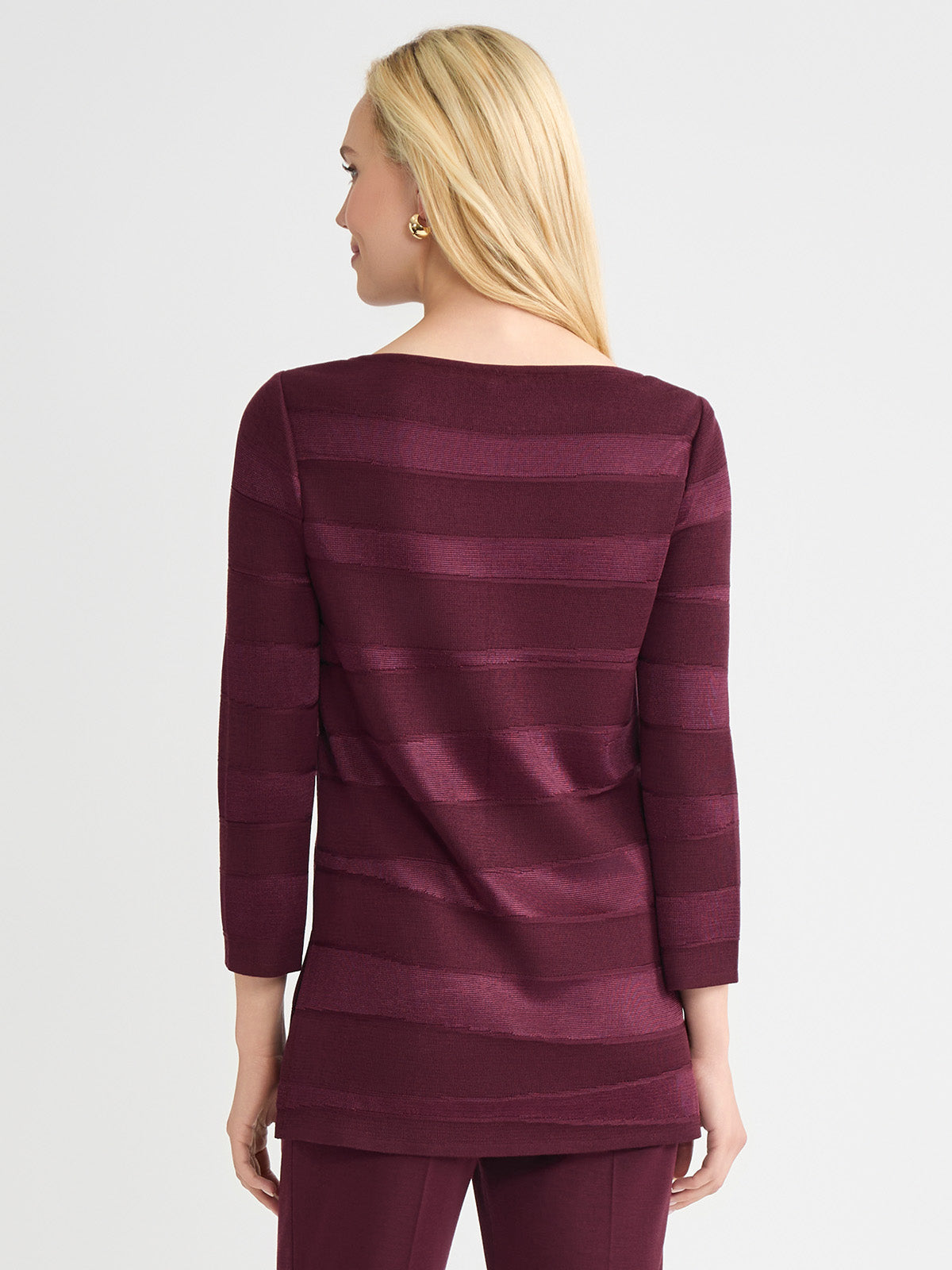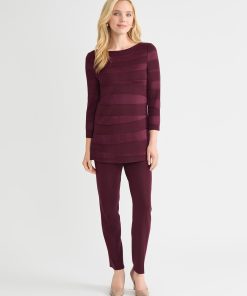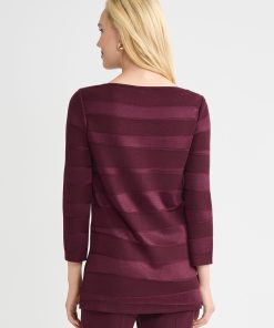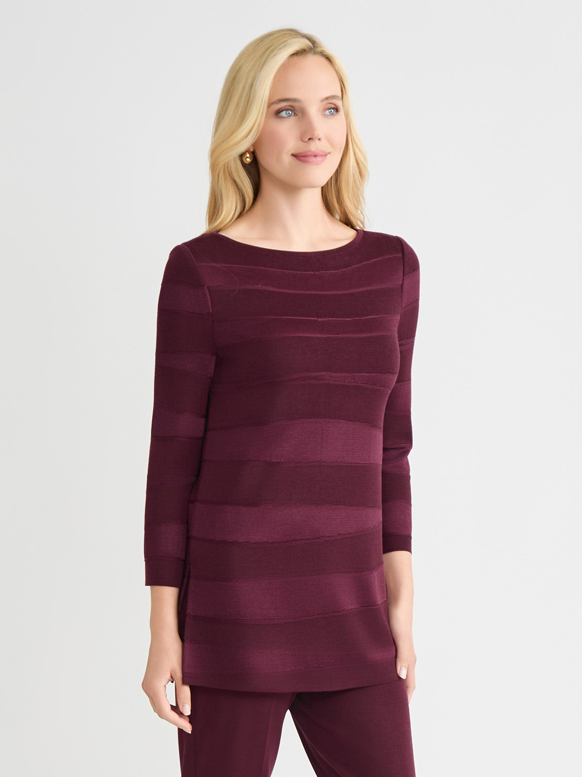 Drape yourself in effortless elegance with this sangria-hued tonal knit tunic, designed to turn heads in the most understated way. The subtle horizontal pattern adds texture and depth, while the boat neckline lends a touch of graceful poise. Crafted as a pullover for ease and comfort, it features deep side slits that bring both fluidity and flair to your silhouette. Whether you’re dressing up for a candlelit dinner or adding polish to a casual-chic ensemble, this tunic is your go-to for refined simplicity with a modern edge.