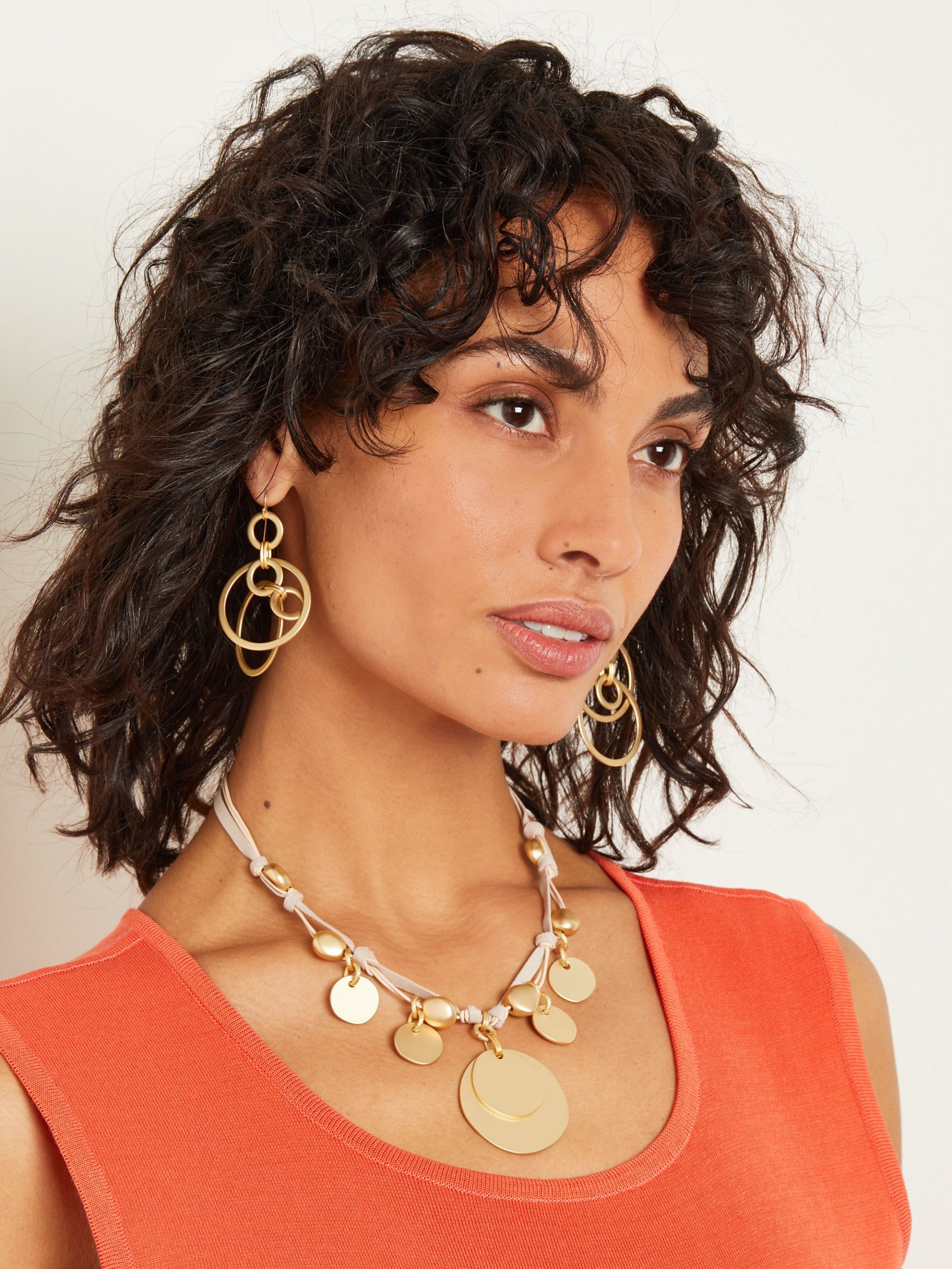 Warm tones and golden metals lend an earthy allure to our Matte Gold Coin Charm Natural Leather & Suede Necklace. Raw bronze leather and suede chords intertwine to link golden accents and a smooth, irregular coin as the featured pendant. Perfect a neutral ensemble with its radiance and richly hand-crafted details.