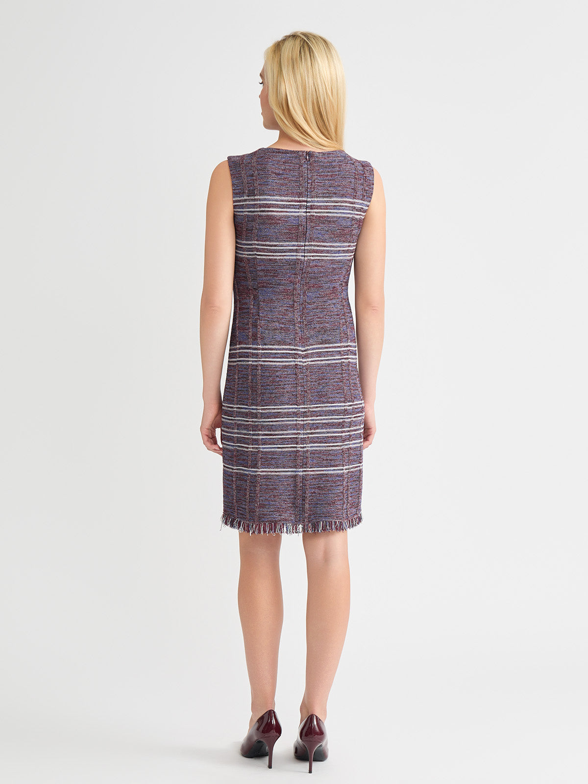 Sleek, tailored, and effortlessly elegant—the Sleeveless Mélange Fringe Trim Knit Sheath Dress is designed to make a lasting impression. Crafted from a beautifully textured knit with subtle mélange tones, this 38-inch sheath silhouette skims the figure with refined ease. Perfect for date nights, receptions, or gallery evenings, this dress is a versatile statement in modern occasion dressing. Pair under the matching Melange Jacket for a tonal look.