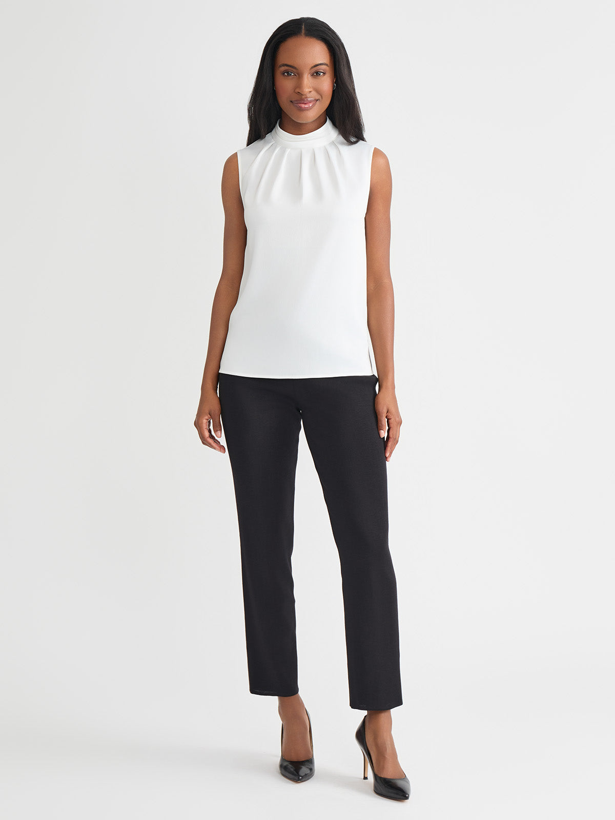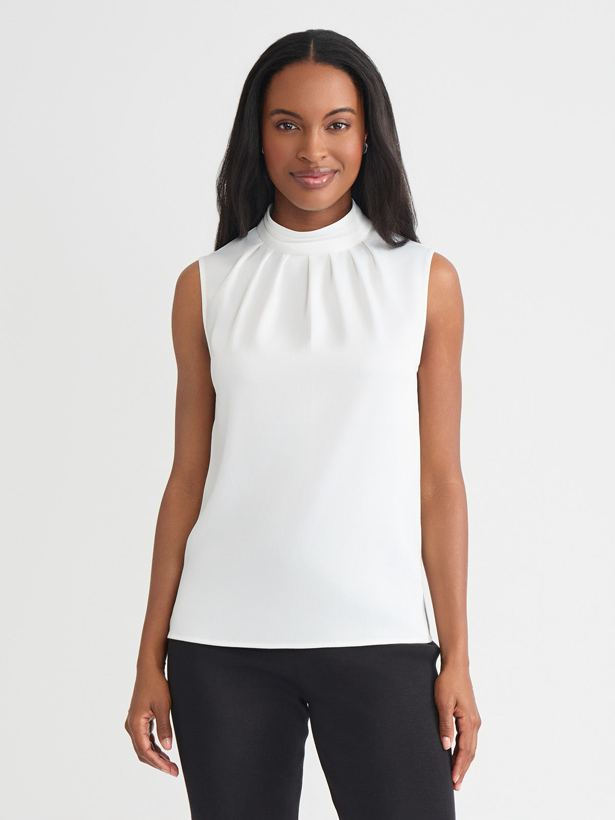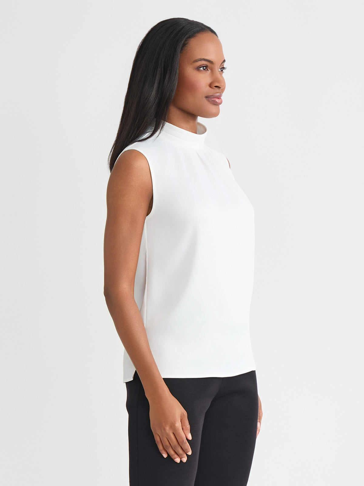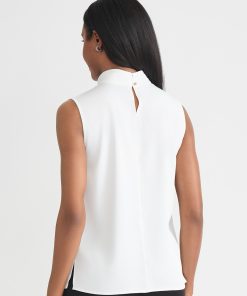 Layer your everyday looks with this crisp, white blouse that instantly freshens your ensemble with a timeless color that captures warmth and light. The crepe de chine fabric is soft and flowy with an unlined fit that allows the top to be worn alone or blend perfectly under additional layers. The high mock neck features neat pleats that serve as a decorative detail, adding to this blouse’s fresh, sophisticated look.