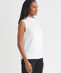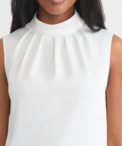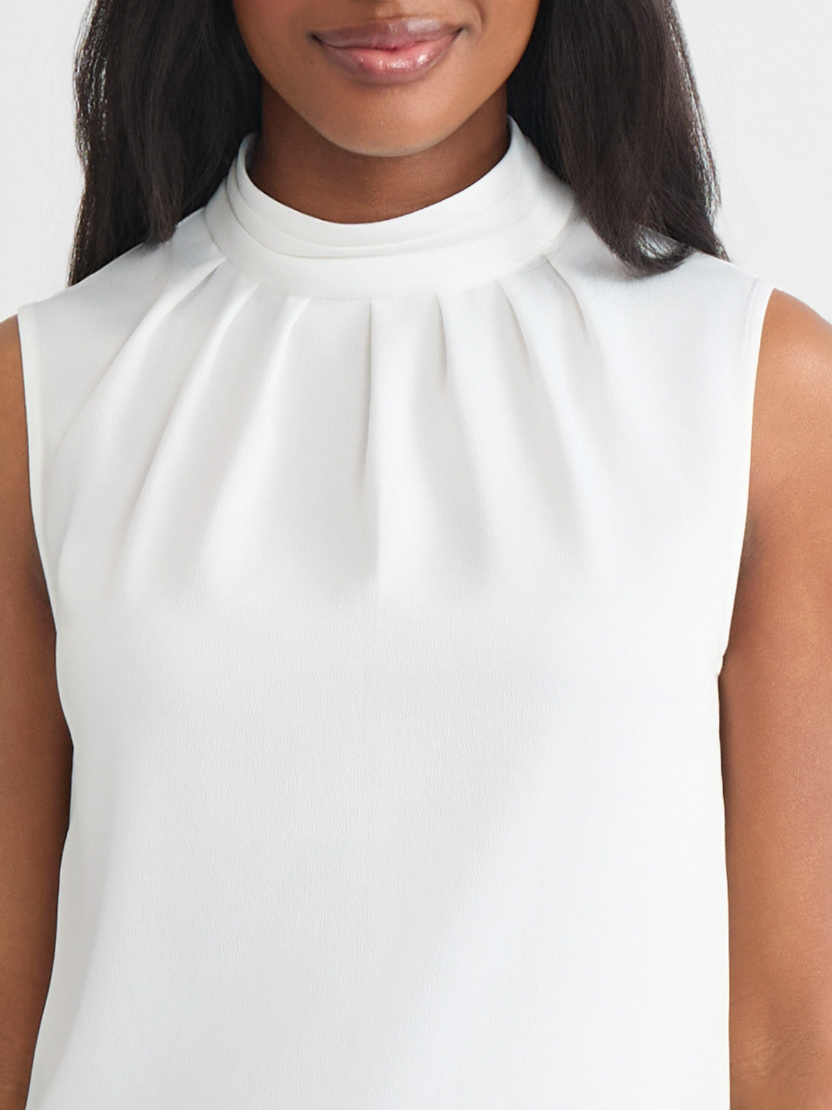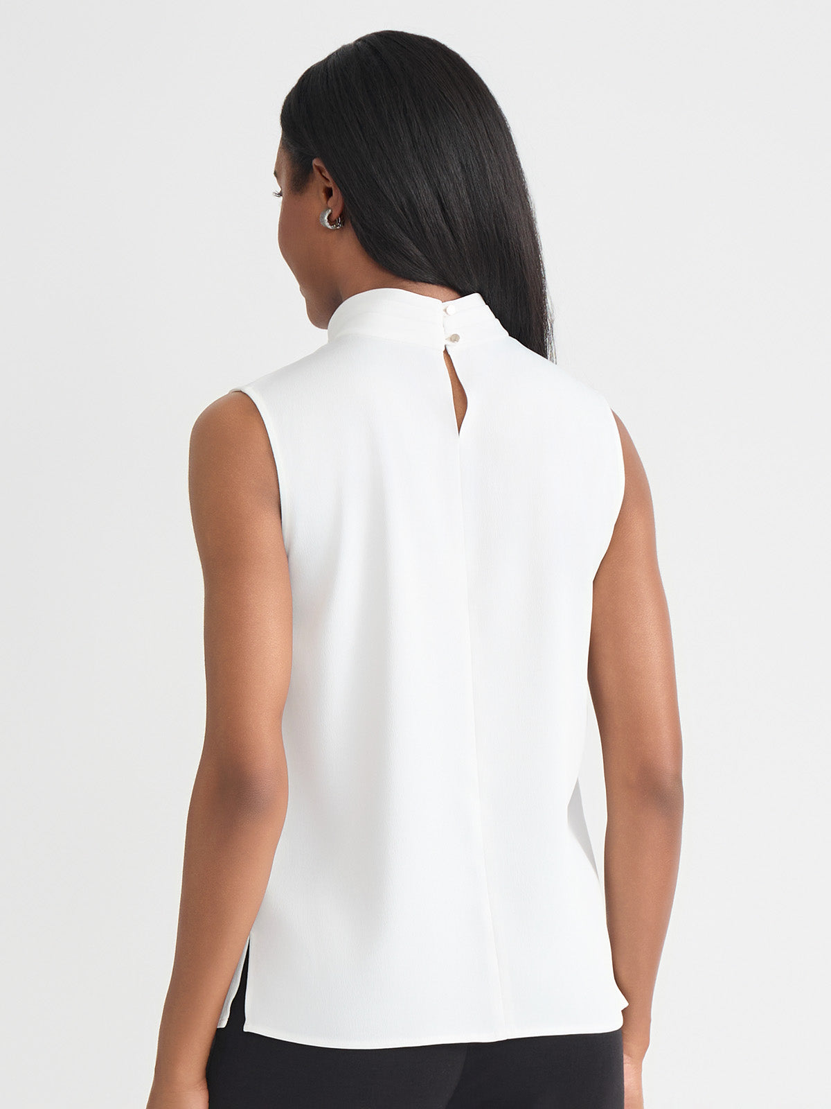 Sleeveless; Mock Pleated Neck; Loop Button Closure in Back; Unlined