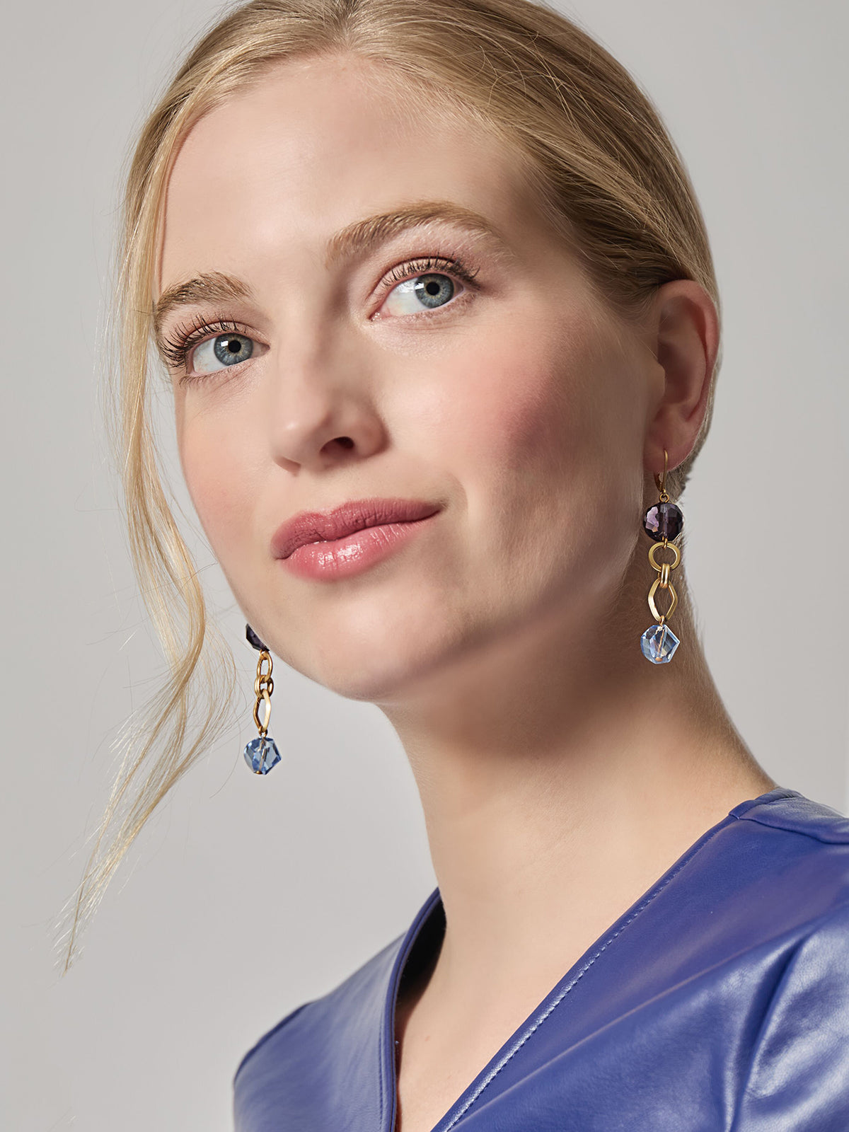 Dazzle your friends with these gorgeous crystal earrings. Featuring Tanzanite and Light Blue crystal, these earring are the perfect conversation piece. These earring are plated with 18K matte gold to ensure they never lose their sparkle.