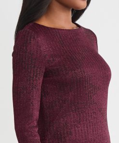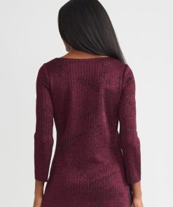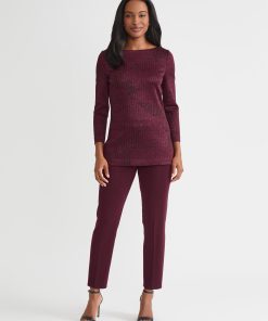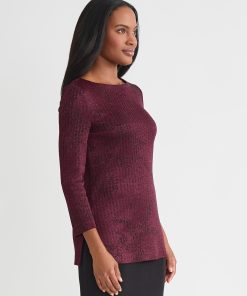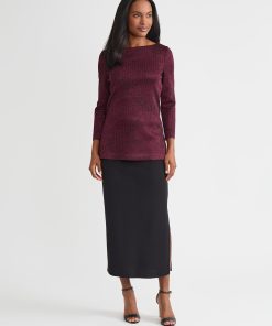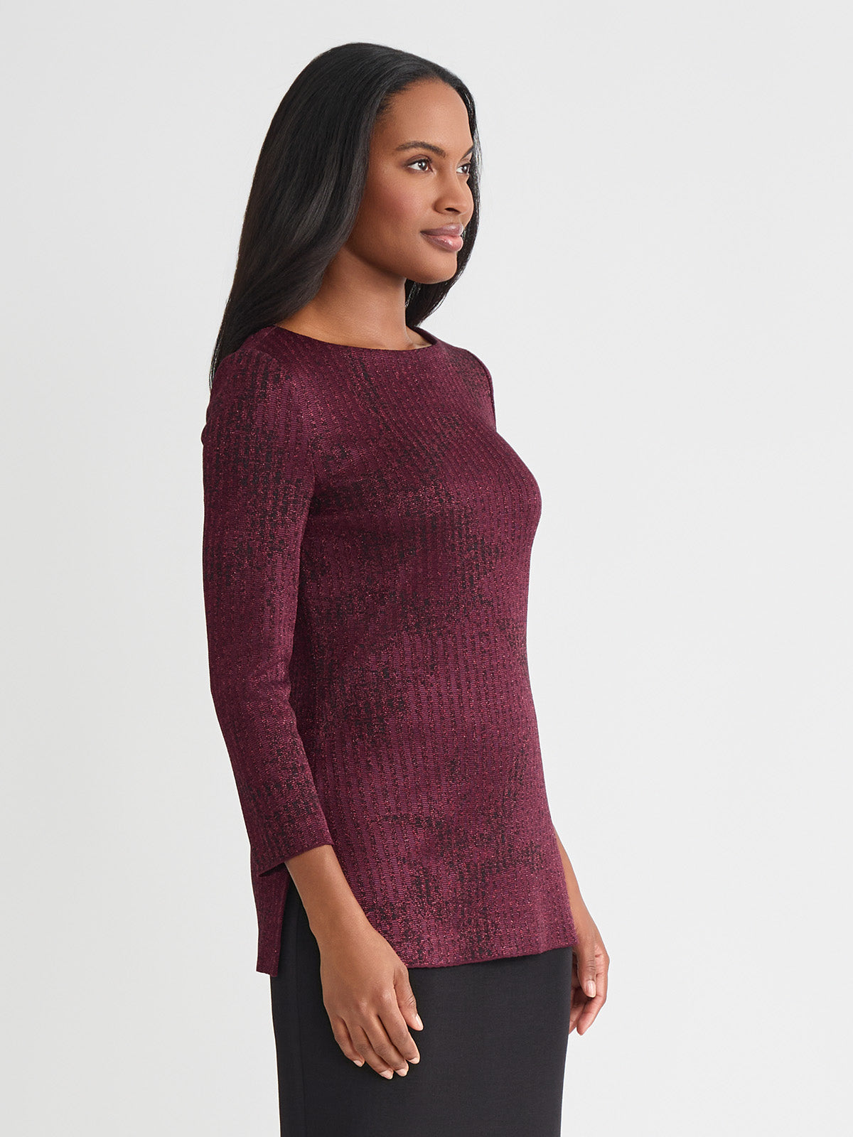 Slip into sophistication with this shimmer-knit tunic, where tonal patterning meets effortless allure. The rich sangria and black colorway creates a sultry contrast, while a delicate shimmer catches the light with every step. Designed with a graceful boat neckline and a relaxed pullover silhouette, it glides over the figure, finishing with deep side slits that add dramatic movement and modern ease. Perfect for soirées, artful evenings, or simply when you want your style to whisper elegance.
